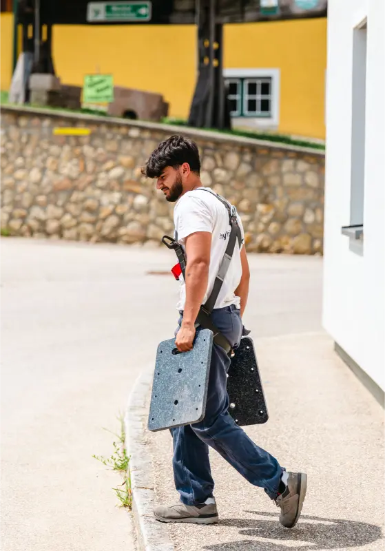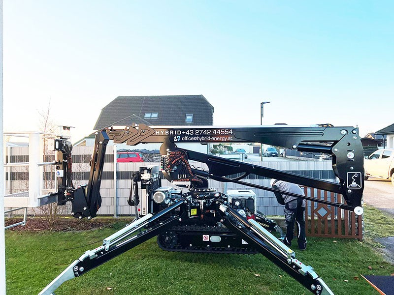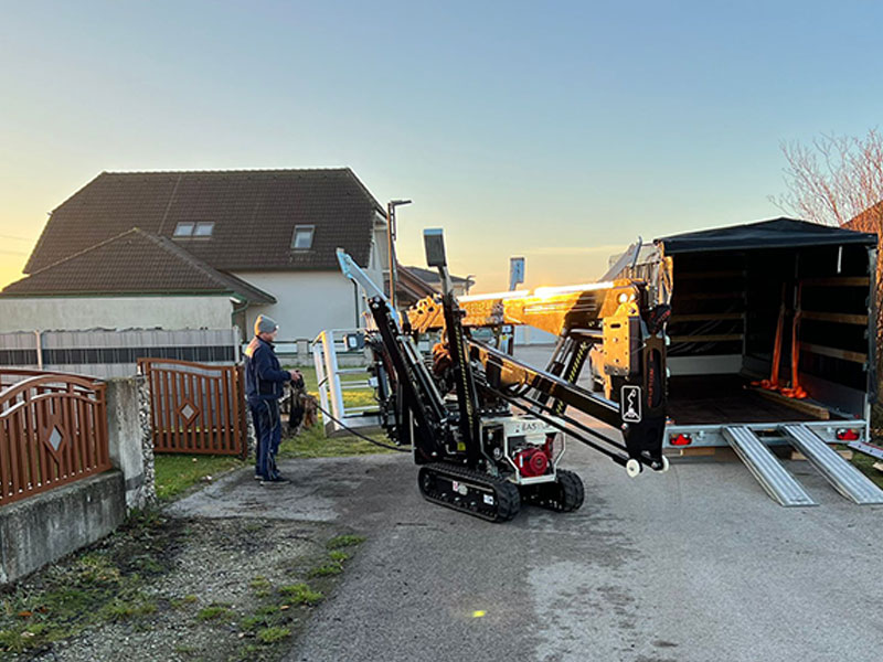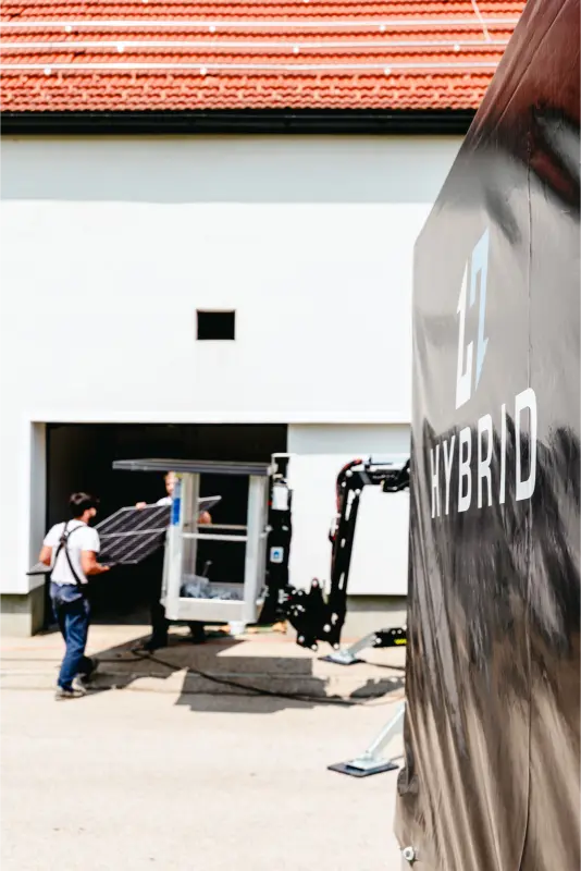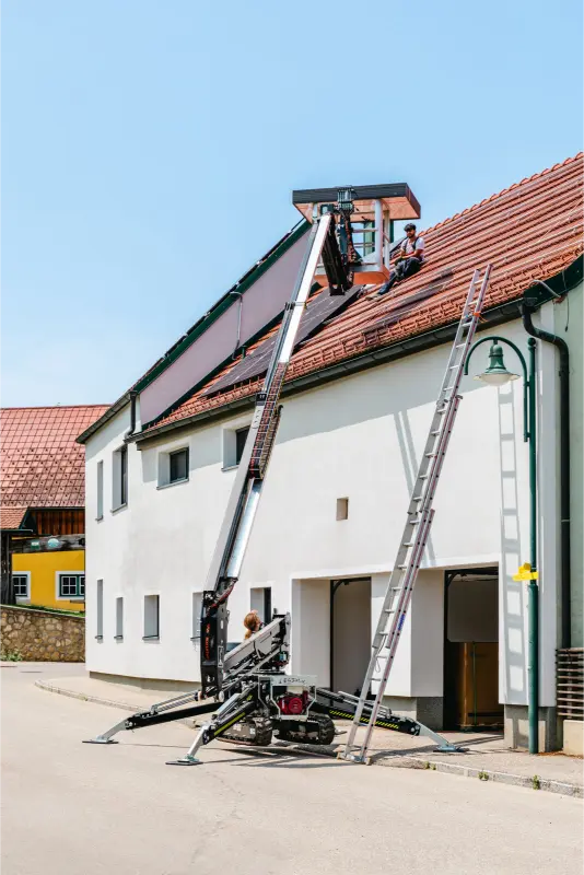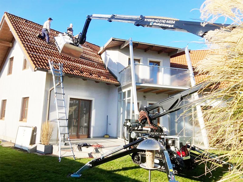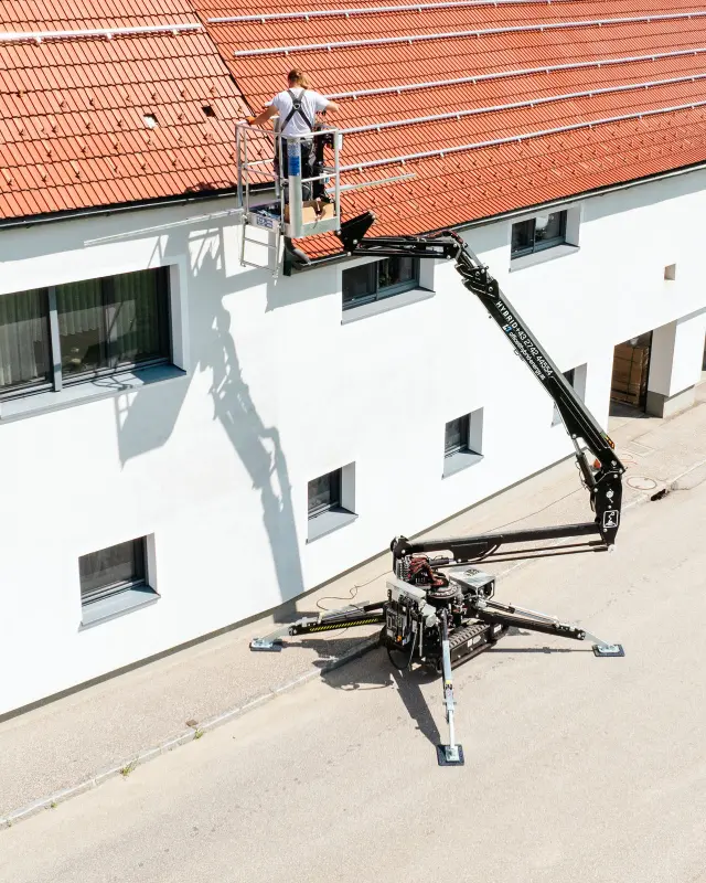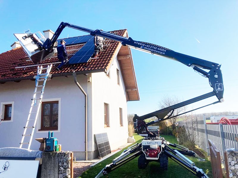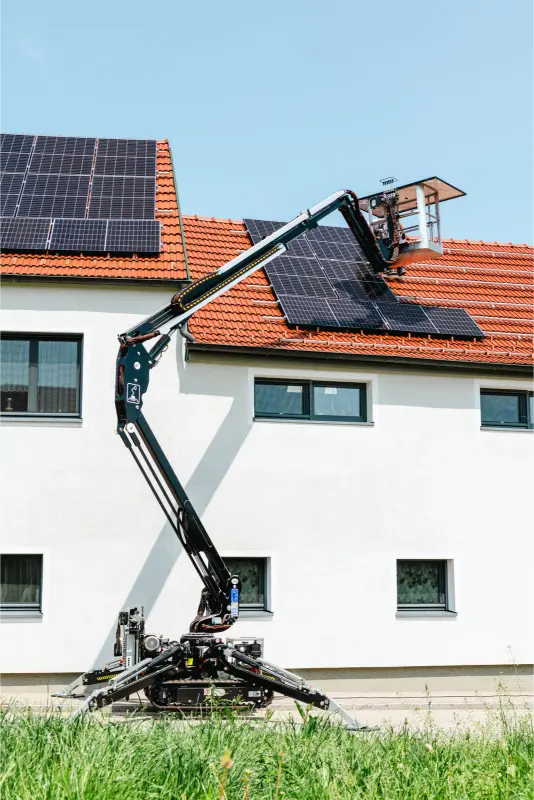 Viele Firmen verwenden für die Montage von PV Anlagen einen LKW-Kran. Allerdings kommt man damit in vielen Fällen nicht perfekt an das jeweilige Dach heran (z. B. auf der Rückseite des Hauses). Ein weiterer Nachteil: Durch das Befahren mit schwerem Gerät wird der Garten in Mitleidenschaft gezogen.